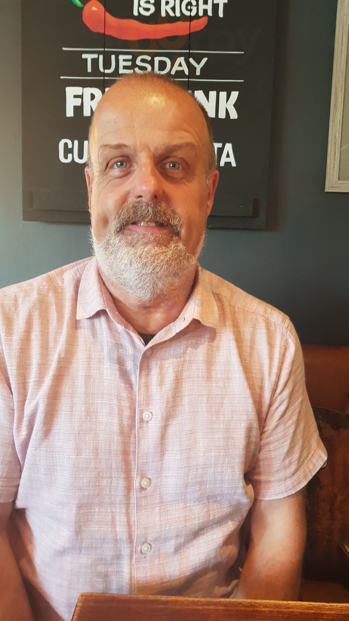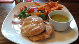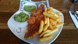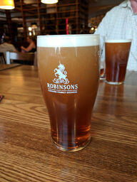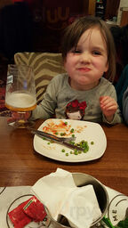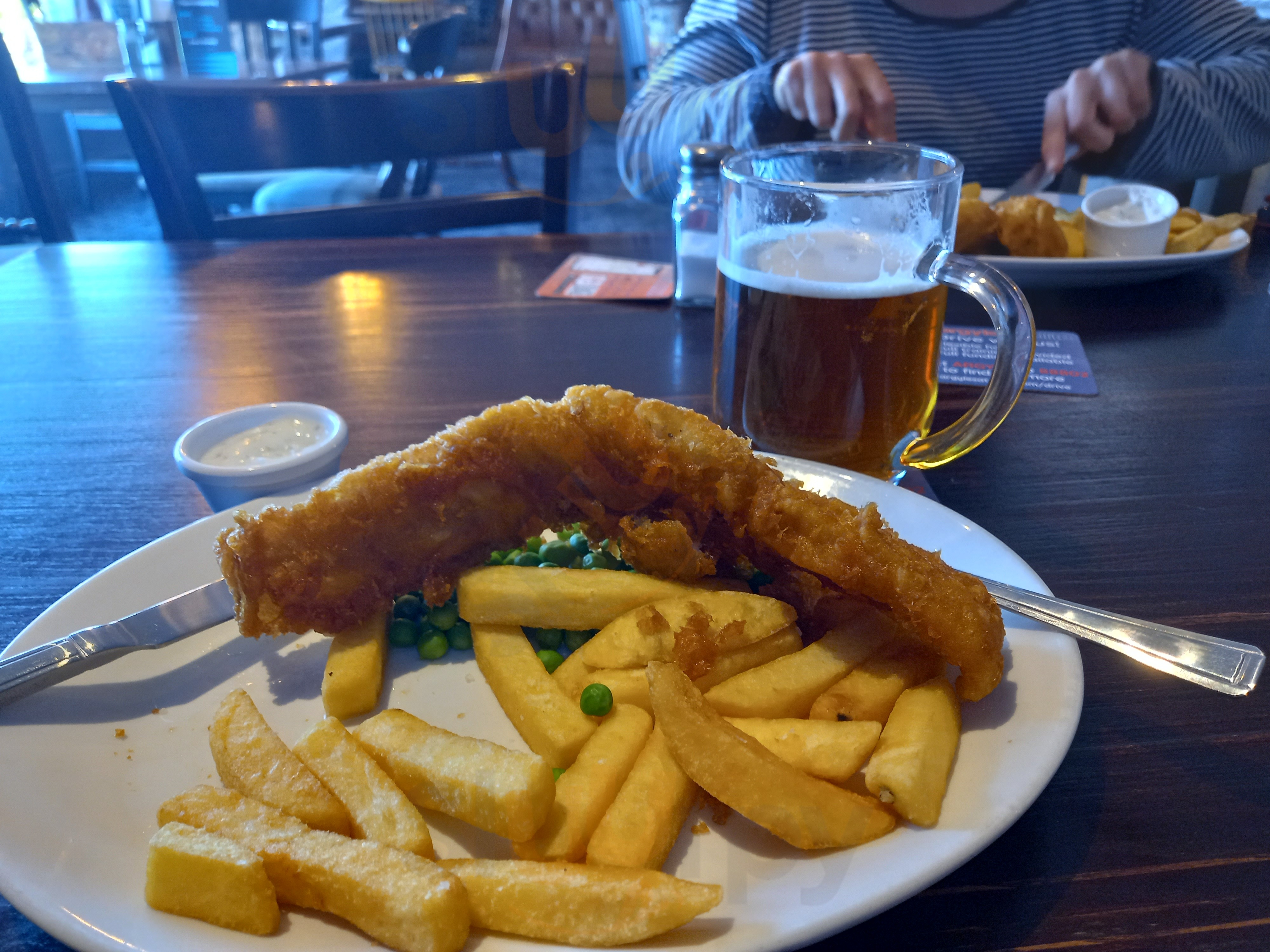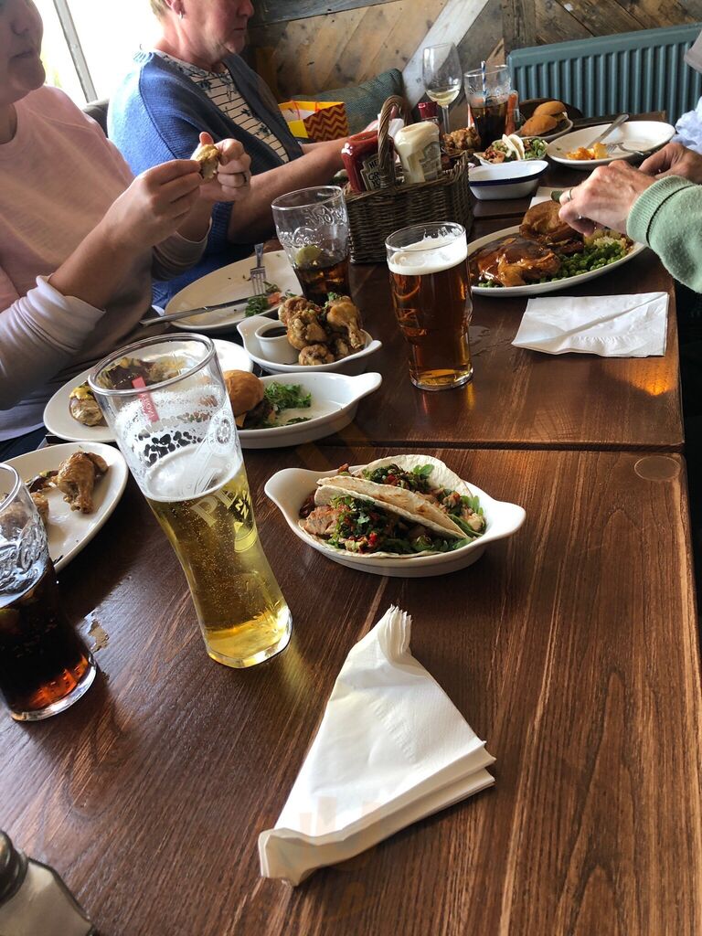 We sat in the beer garden. In the rain but was covered so a great place. Our drink choices were sadly out of stock but there were plenty of alternatives. We ate lunch and enjoyed the food. Hubby had fish and chips and I had the superseded salad with chicken thighs. Very nice. Staff friendly too.